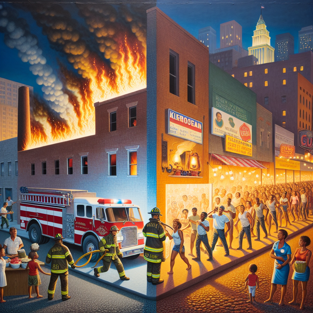 ChatGPT: In a peaceful Kentucky town, firemen douse the last flickering flames of an arson incident, while in bustling Cuban streets, locals line up to purchase kerosene for their lanterns and stoves. The contrast of the extinguished fire and the glowing kerosene lamps highlights the shift in demand as Kentucky's arson incidents decrease and Cuba's need for kerosene increases.