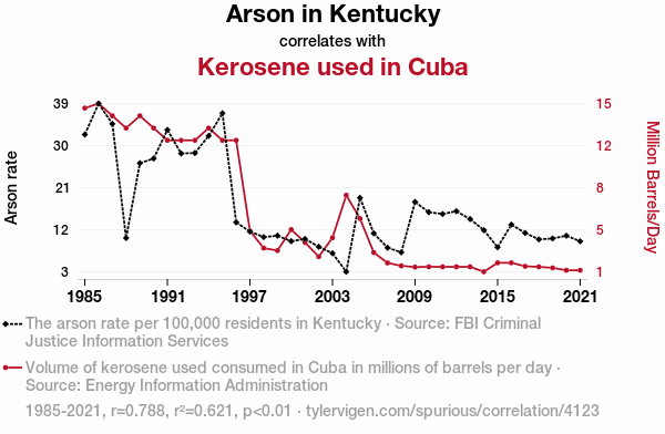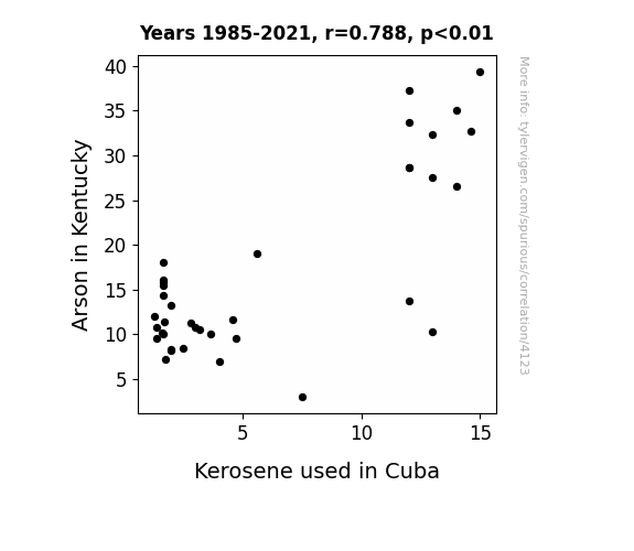 This means 62.1% of the change in the one variable (i.e., Kerosene used in Cuba) is predictable based on the change in the other (i.e., Arson in Kentucky) over the 37 years from 1985 through 2021.