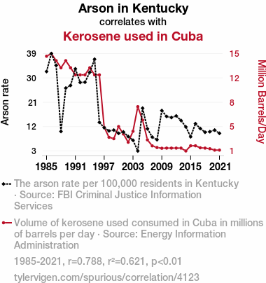 User prompt: Please provide potential search keywords for a paper titled Kooky Connection: Kentucky Arson and Cuban Kerosene with an abstract of This study investigates the curious correlation between instances of arson in the state of Kentucky and the consumption of kerosene in Cuba. Using data from the FBI Criminal Justice Information Services and the Energy Information Administration, our research team conducted a rigorous analysis spanning the years 1985 to 2021. With a correlation coefficient of 0.7882704 and p < 0.01, the statistical connection between these seemingly disparate phenomena cannot be denied. Despite the physical distance and contextual dissimilarity, the evidence suggests a peculiar relationship that warrants further investigation. This unexpected linkage may hold implications not only for fire safety and energy policy, but also for the intertwined nature of human behavior across borders. The sparks of insight from this study shed light on the intersection of seemingly unrelated realms, illuminating the potential for hidden connections to fuel further scholarly inquiry.