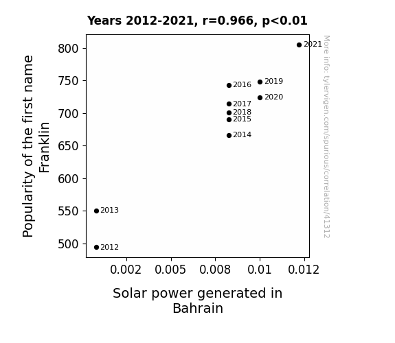 This means 93.3% of the change in the one variable (i.e., Solar power generated in Bahrain) is predictable based on the change in the other (i.e., Popularity of the first name Franklin) over the 10 years from 2012 through 2021.