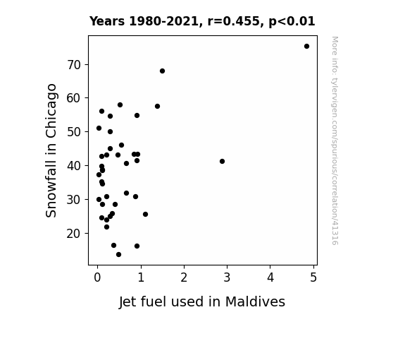 This means 20.7% of the change in the one variable (i.e., Jet fuel used in Maldives) is predictable based on the change in the other (i.e., Snowfall in Chicago) over the 40 years from 1980 through 2021.