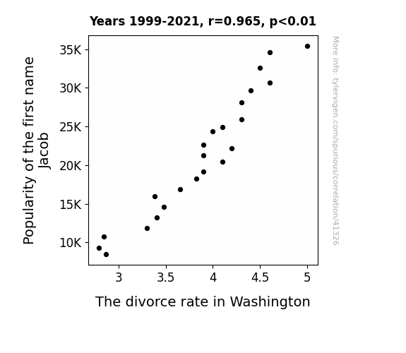 This means 93.2% of the change in the one variable (i.e., The divorce rate in Washington) is predictable based on the change in the other (i.e., Popularity of the first name Jacob) over the 23 years from 1999 through 2021.