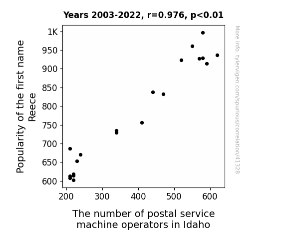 This means 95.3% of the change in the one variable (i.e., The number of postal service machine operators in Idaho) is predictable based on the change in the other (i.e., Popularity of the first name Reece) over the 20 years from 2003 through 2022.