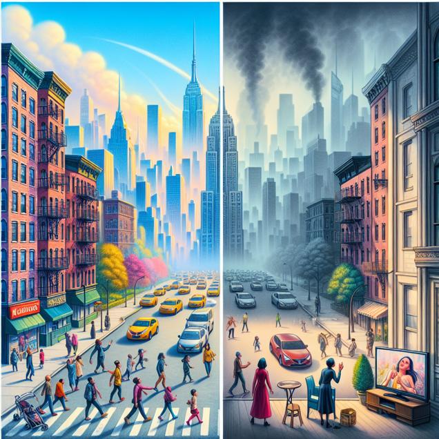 Prompt: Prompt: Generate an image in the style of a Discovery magazine cover, showcasing New York City's clear skyline in contrast to the usual smog and pollution. People are walking on the streets, visibly taking deep breaths of fresh air and admiring the unobstructed cityscape. In a nearby apartment building, a television screen displays a scene from Days of Our Lives, with a lower-than-usual viewership count visible. The connection between the clean air and the decline in the show's viewership creates a perplexing juxtaposition. The depiction should include only scenes, people, and objects, it should not include text or speech bubbles.