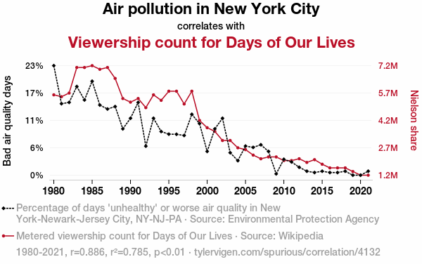 A linear line chart with years as the X-axis and two variables on the Y-axis. The first variable is Air pollution in New York City and the second variable is Viewership count for Days of Our Lives.  The chart goes from 1980 to 2021, and the two variables track closely in value over that time. Small Image