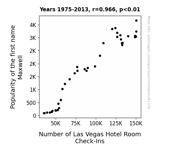 This means 93.3% of the change in the one variable (i.e., Number of Las Vegas Hotel Room Check-Ins) is predictable based on the change in the other (i.e., Popularity of the first name Maxwell) over the 39 years from 1975 through 2013.