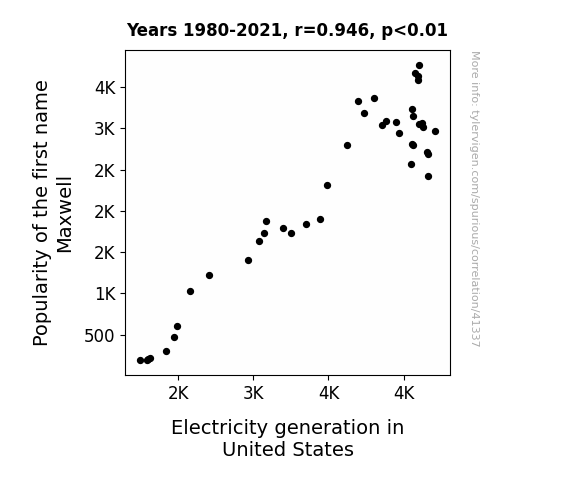 This means 89.5% of the change in the one variable (i.e., Electricity generation in United States) is predictable based on the change in the other (i.e., Popularity of the first name Maxwell) over the 42 years from 1980 through 2021.