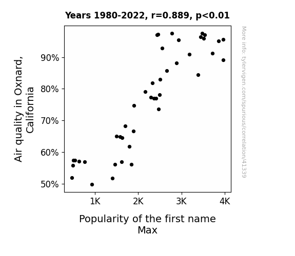 This means 79.1% of the change in the one variable (i.e., Popularity of the first name Max) is predictable based on the change in the other (i.e., Air quality in Oxnard, California) over the 43 years from 1980 through 2022.