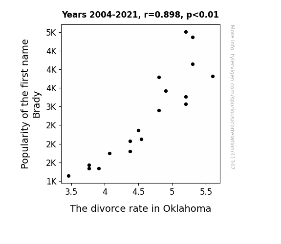 This means 80.6% of the change in the one variable (i.e., The divorce rate in Oklahoma) is predictable based on the change in the other (i.e., Popularity of the first name Brady) over the 18 years from 2004 through 2021.