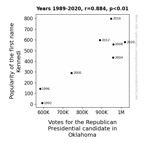This means 78.2% of the change in the one variable (i.e., Votes for the Republican Presidential candidate in Oklahoma) is predictable based on the change in the other (i.e., Popularity of the first name Kennedi) over the 8 years from 1989 through 2020.