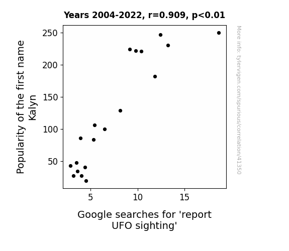 This means 82.6% of the change in the one variable (i.e., Google searches for 'report UFO sighting') is predictable based on the change in the other (i.e., Popularity of the first name Kalyn) over the 19 years from 2004 through 2022.