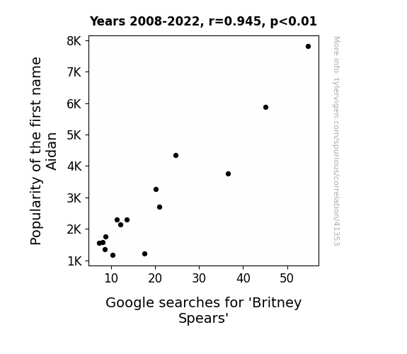 This means 89.3% of the change in the one variable (i.e., Google searches for 'Britney Spears') is predictable based on the change in the other (i.e., Popularity of the first name Aidan) over the 15 years from 2008 through 2022.