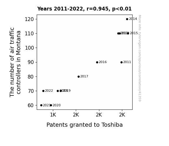 This means 89.3% of the change in the one variable (i.e., Patents granted to Toshiba) is predictable based on the change in the other (i.e., The number of air traffic controllers in Montana) over the 12 years from 2011 through 2022.
