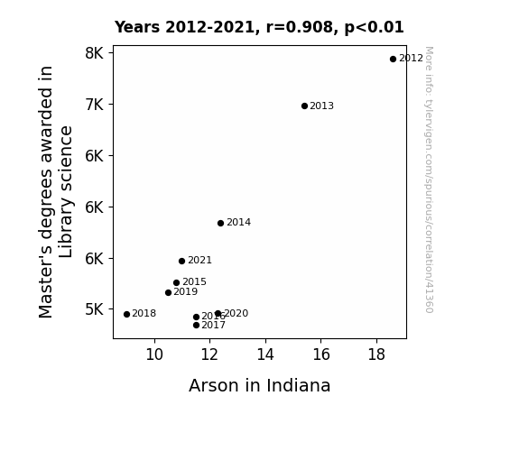 This means 82.4% of the change in the one variable (i.e., Arson in Indiana) is predictable based on the change in the other (i.e., Master's degrees awarded in Library science) over the 10 years from 2012 through 2021.