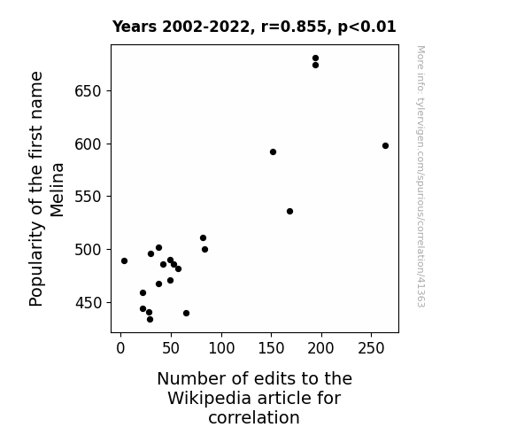 This means 73.2% of the change in the one variable (i.e., Number of edits to the Wikipedia article for correlation) is predictable based on the change in the other (i.e., Popularity of the first name Melina) over the 21 years from 2002 through 2022.