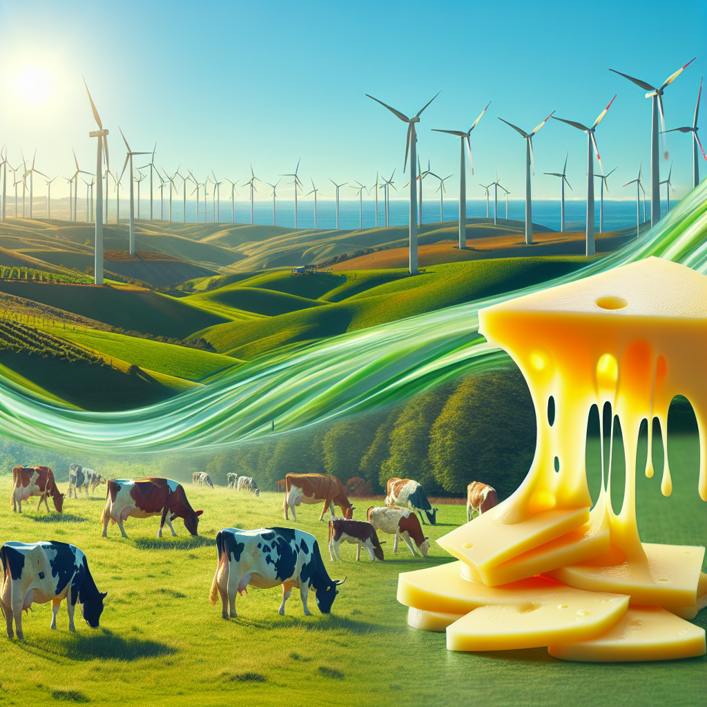 ChatGPT: Generate an image of a vibrant countryside with lush green fields and rolling hills. In the foreground, depict a group of contented dairy cows grazing peacefully. Behind them, show slices of American cheese warming and melting under the gentle rays of the sun. As the cheese melts, create a transition to the Chilean landscape, featuring majestic wind turbines spinning gracefully amidst the beautiful scenery. Capture the ripple effect of the melting cheese reaching the wind turbines, symbolizing the global impact of sustainable energy in cheese production. The image should illustrate the harmonious coexistence of farming, renewable energy, and the interconnectedness of the global landscape.