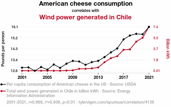 no direct connection between these variables, despite what the AI says above. This is exacerbated by the fact that I used "Years" as the base variable. Lots of things happen in a year that are not related to each other! Most studies would use something like "one person" in stead of "one year" to be the "thing" studied. - Observations not independent: For many variables, sequential years are not independent of each other. If a population of people is continuously doing something every day, there is no reason to think they would suddenly change how they are doing that thing on January 1. A simple