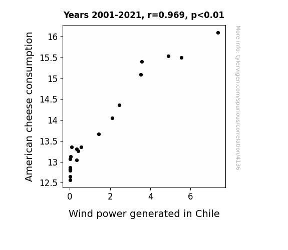 Fig. 1 showcases this relationship in a visually appealing scatterplot that would make any dairy farmer proud (of course, they would say it's Gouda!). It's as clear as day that as American cheese consumption curdled up, so did the wind power generated in Chile.