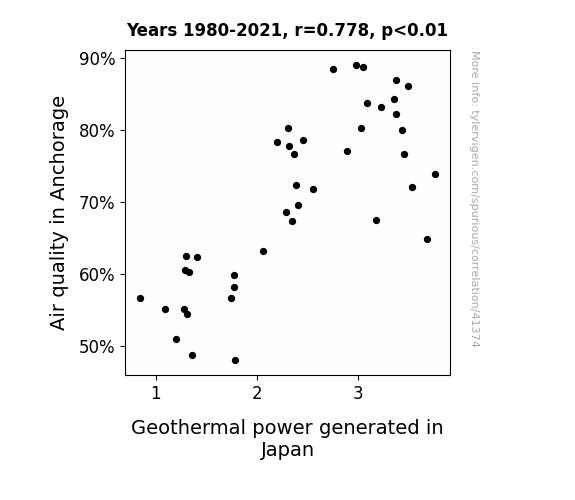 This means 60.6% of the change in the one variable (i.e., Geothermal power generated in Japan) is predictable based on the change in the other (i.e., Air quality in Anchorage) over the 42 years from 1980 through 2021.
