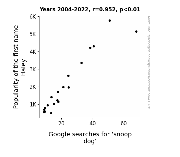 This means 90.7% of the change in the one variable (i.e., Google searches for 'snoop dog') is predictable based on the change in the other (i.e., Popularity of the first name Haley) over the 19 years from 2004 through 2022.