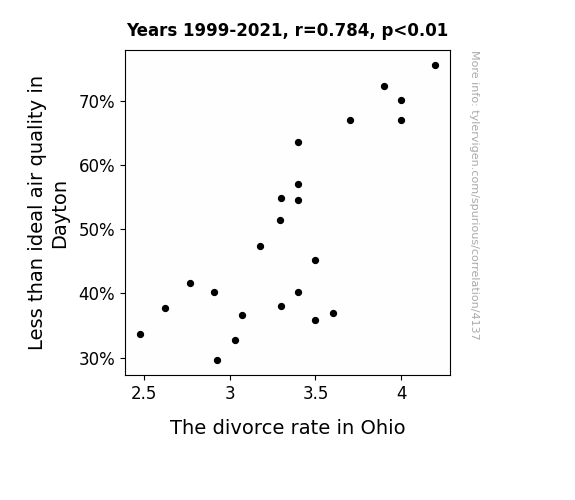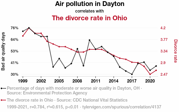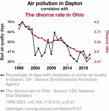 - The spurious research paper: When the Air Clears: Uncovering the Relationship Between Air Pollution in Dayton and the Divorce Rate in Ohio