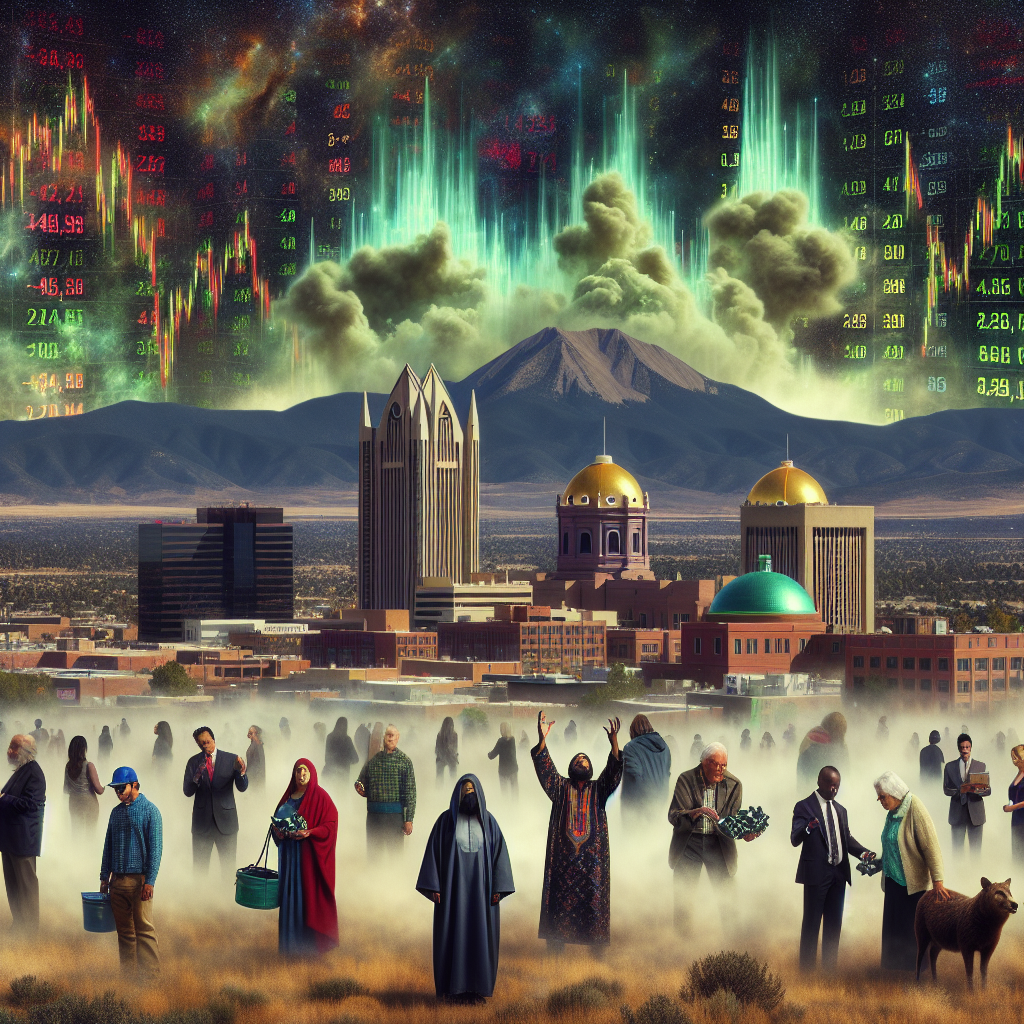 ChatGPT: Generate an image of a meme where the skyline of Los Alamos, New Mexico is obscured by a thick, surreal haze. The haze holds the rising stock prices of Advanced Micro Devices (AMD) within the city limits, creating an almost mystical barrier. Amidst this hazy backdrop, residents are shown eagerly engaged in buying and selling AMD stocks, capturing the chaotic yet opportunistic trading frenzy caused by the localized surge in demand. Emphasize the surreal and captivating nature of the financial smog-fest, drawing attention to the juxtaposition of the mundane act of stock trading and the peculiar atmospheric conditions.