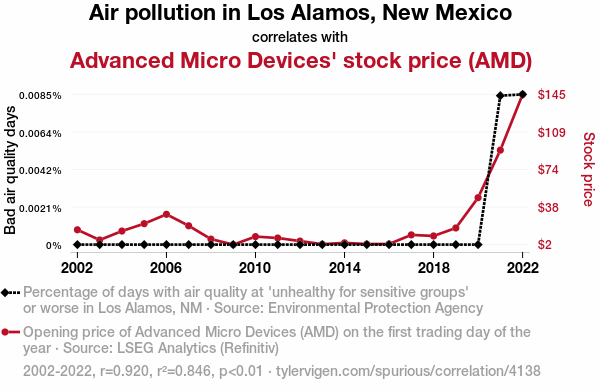 A linear line chart with years as the X-axis and two variables on the Y-axis. The first variable is Air pollution in Los Alamos, New Mexico and the second variable is Advanced Micro Devices' stock price (AMD).  The chart goes from 2002 to 2022, and the two variables track closely in value over that time. Small Image