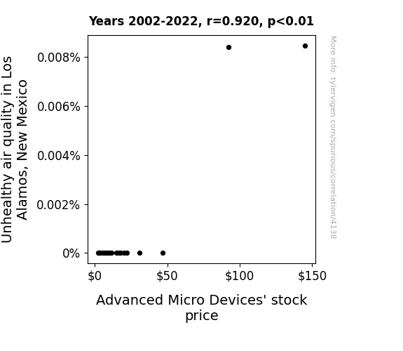 This means 84.6% of the change in the one variable (i.e., Advanced Micro Devices' stock price (AMD)) is predictable based on the change in the other (i.e., Air pollution in Los Alamos, New Mexico) over the 21 years from 2002 through 2022.