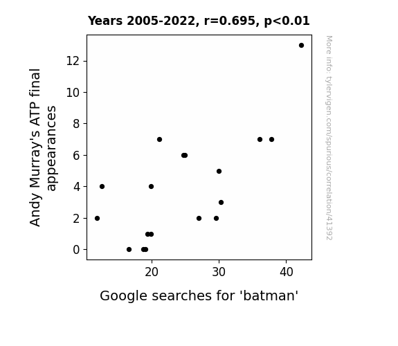A linear line chart with years as the X-axis and two variables on the Y-axis. The first variable is Andy Murray's ATP final appearances and the second variable is Google searches for 'batman'.  The chart goes from 2005 to 2022, and the two variables track closely in value over that time. Small Image