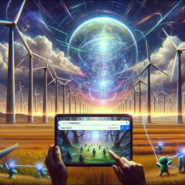 Prompt: Generate an image of a futuristic landscape with a vast field in Kazakhstan. In the background, the sky is filled with towering wind turbines elegantly spinning in the breeze. In the foreground, a computer screen displays a surge of Google searches for "Roblox," lighting up the search bar. As the turbines turn, a mysterious energy signal is emitted, traveling through the air and into the virtual world of Roblox. Energetic players are drawn into the game, symbolizing the unexpected synchronization of wind power and an online adventure. The depiction should include only scenes, people, and objects, it should not include text or speech bubbles.