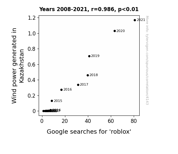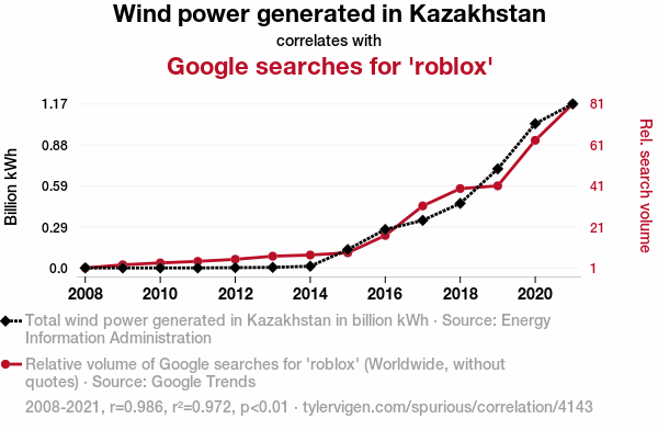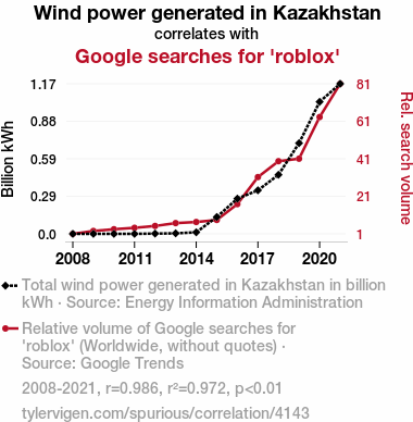- The spurious research paper: Blowin' in the Wind: A Breezy Connection Between Wind Power in Kazakhstan and Google Searches for 'Roblox'