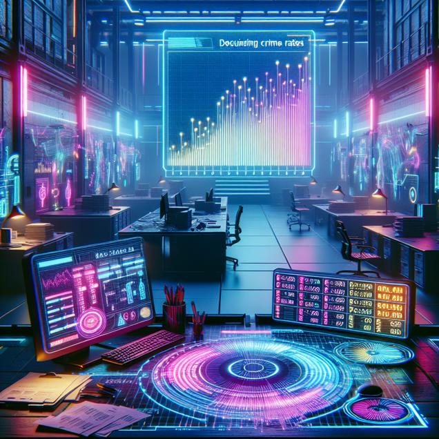 Prompt: Generate an image of a sleek, futuristic office with holographic displays and neon lights casting an otherworldly glow. In the center, a desk once piled high with timecards and payrolls now sits mostly empty, with an advanced AI system efficiently managing the remaining workload. In the background, a large digital screen displays a visual representation of declining burglaries in Alabama, graphically showcasing the impact of reduced criminal activity on the office's workload. The overall ambiance should exude a sense of technological advancement and societal progress, blending elements of cyberpunk with a tangible sense of positive change. The depiction should include only scenes, people, and objects, it should not include text or speech bubbles.