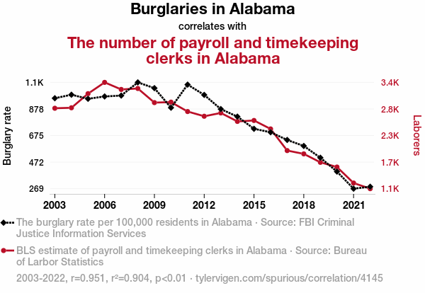 This means 90.4% of the change in the one variable (i.e., The number of payroll and timekeeping clerks in Alabama) is predictable based on the change in the other (i.e., Burglaries in Alabama) over the 20 years from 2003 through 2022.