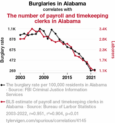The results of our investigation unveiled a striking correlation between the number of payroll and timekeeping clerks in Alabama and the rate of burglaries over the period of 2003 to 2022. The correlation coefficient of 0.9508284 indicated a remarkably strong positive relationship between these seemingly distinct phenomena. This correlation suggests that as the number of payroll and timekeeping clerks in Alabama increased, so did the incidence of burglaries. It appears that the more closely time is tracked, the more opportunities burglars find to sneak in uninvited! It's almost as if burglars have a personal interest in payroll growth!