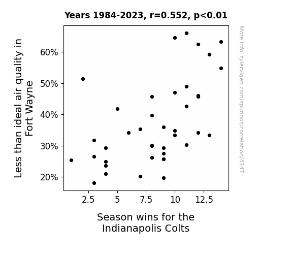 - The spurious research paper: From Haze to Hail Marys: Examining the Impact of Air Pollution on the Gridiron: A Study of the Relationship between Air Pollution Levels in Fort Wayne and Season Wins for the Indianapolis Colts