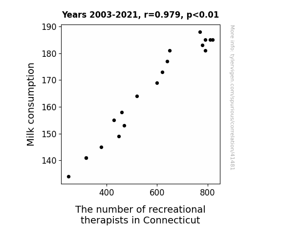 This means 95.9% of the change in the one variable (i.e., The number of recreational therapists in Connecticut) is predictable based on the change in the other (i.e., Milk consumption) over the 19 years from 2003 through 2021.