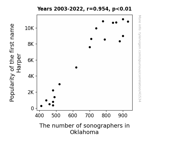 This means 91.1% of the change in the one variable (i.e., The number of sonographers in Oklahoma) is predictable based on the change in the other (i.e., Popularity of the first name Harper) over the 20 years from 2003 through 2022.