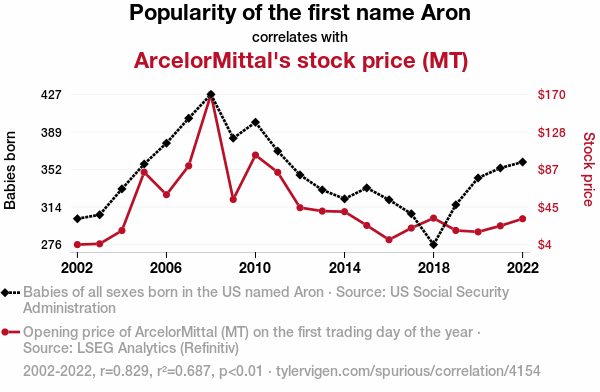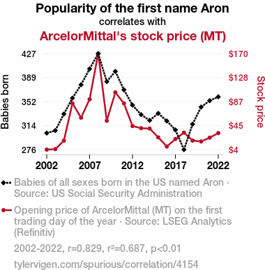 User prompt: Please provide potential search keywords for a paper titled Aron and ArcelorMittal: The A-Steel Connection! with an abstract of Our research delves into the unexpected link between the popularity of the first name "Aron" and ArcelorMittal's stock price (MT) over the past two decades. Combining data from the US Social Security Administration and LSEG Analytics (Refinitiv), we sought to shed light on this quirky correlation.
