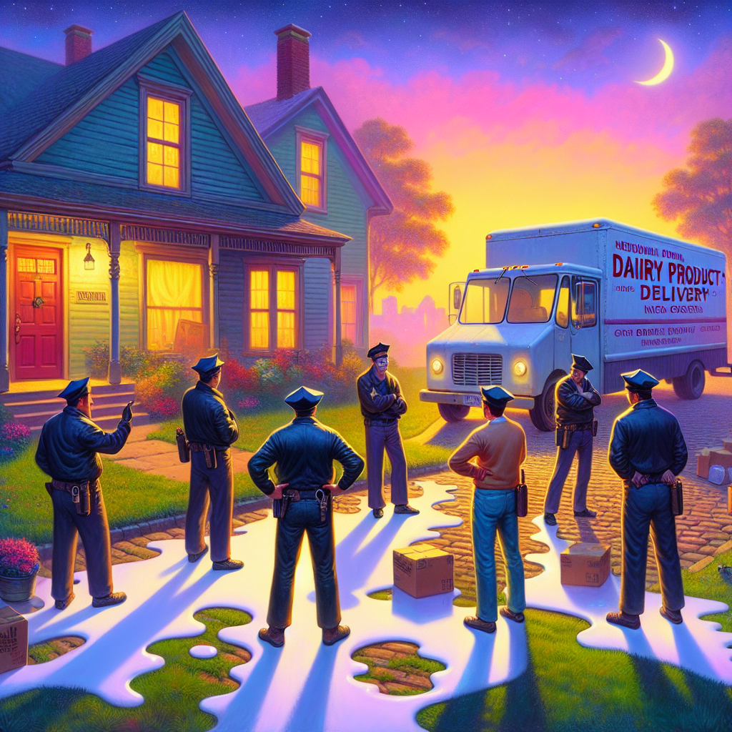 Prompt: An image of a quiet neighborhood in Washington with a group of burglars standing outside a house, looking puzzled. In the background, a large truck labeled "Milk Delivery" drives away, leaving behind a trail of spilled milk. The burglars scratch their heads and glance at each other, realizing that there are no more milk deliveries to steal from. With a sigh, they reluctantly decide to walk away, their usual plans foiled by the absence of milk. The setting should have a surreal touch, evoking a sense of magic realism in the atmosphere. The colors should be vibrant, and the lighting should create a dreamlike quality to the scene. The depiction should include only scenes, people, and objects, it should not include text or speech bubbles.