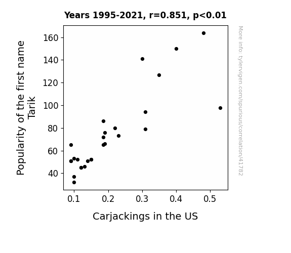 This means 72.3% of the change in the one variable (i.e., Carjackings in the US) is predictable based on the change in the other (i.e., Popularity of the first name Tarik) over the 27 years from 1995 through 2021.