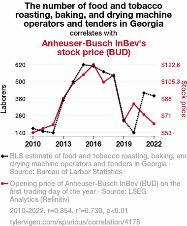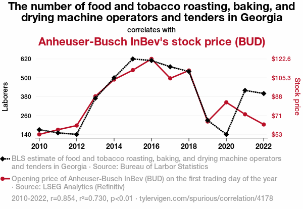 tobacco industry, beer industry, correlation, Georgia, food and tobacco roasting, baking and drying machine operators, tenders, Anheuser-Busch InBev stock price, Bureau of Labor Statistics, LSEG Analytics, Refinitiv, correlation coefficient, p-value, workforce, market forces, industry analysis