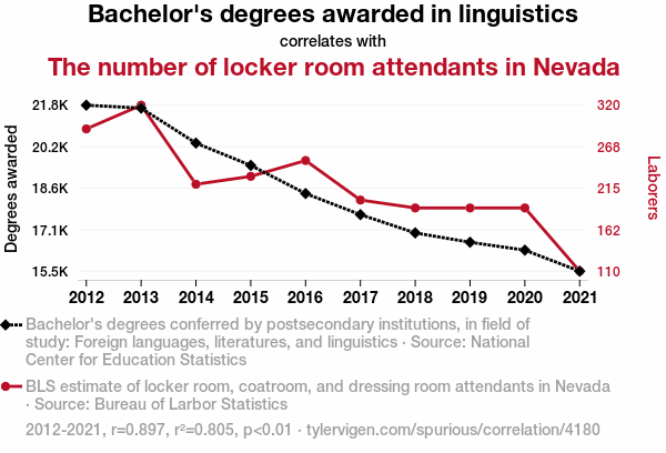 This means 80.5% of the change in the one variable (i.e., The number of locker room attendants in Nevada) is predictable based on the change in the other (i.e., Bachelor's degrees awarded in linguistics) over the 10 years from 2012 through 2021.