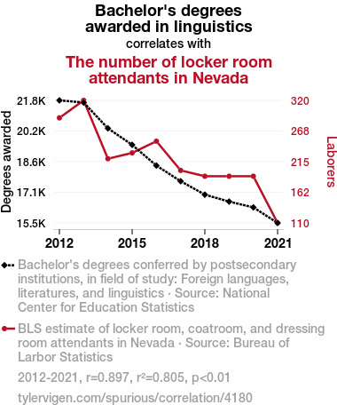 - The spurious research paper: Talking the Talk, Mopping the Floor: A Linguistic Analysis of the Correlation Between Bachelor's Degrees in Linguistics and the Number of Locker Room Attendants in Nevada