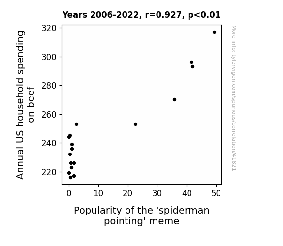 This means 86% of the change in the one variable (i.e., Popularity of the 'spiderman pointing' meme) is predictable based on the change in the other (i.e., Annual US household spending on beef) over the 17 years from 2006 through 2022.
