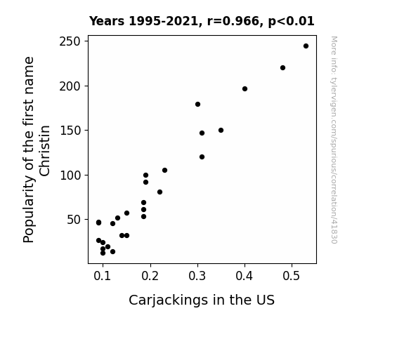 This means 93.3% of the change in the one variable (i.e., Carjackings in the US) is predictable based on the change in the other (i.e., Popularity of the first name Christin) over the 27 years from 1995 through 2021.