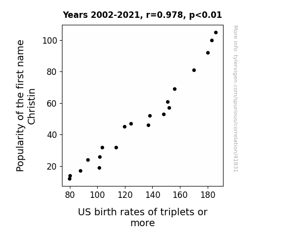 This means 95.6% of the change in the one variable (i.e., US birth rates of triplets or more) is predictable based on the change in the other (i.e., Popularity of the first name Christin) over the 20 years from 2002 through 2021.