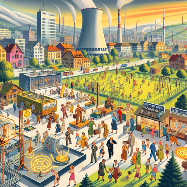 ChatGPT: Generate an image that looks like a scene from a Pixar movie, showing a bustling city in Romania. The scene depicts a steady stream of individuals named Parker arriving, each with a twinkle in their eye and an affinity for nuclear physics. The Parkers settle into their new community and gather in secret, forming a close-knit group with a shared purpose. In a remote corner of the city, a state-of-the-art nuclear power plant hums with activity as the Parkers use their uncanny ability to manipulate electrons, ensuring they are parked in just the right orbit to maximize energy output. Outside the plant, playgrounds are abuzz with the sound of parents calling out "Parker" as their children dash about. The image should capture both the excitement of the bustling city and the connection between the Parkers and the city's newfound prominence in nuclear energy in a simple, visually pleasing manner.