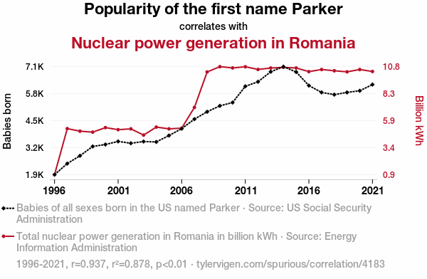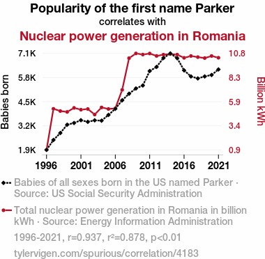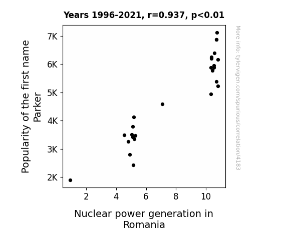 Parker Power, Romania, nuclear power, popularity of name "Parker", US Social Security Administration data, Energy Information Administration data, correlation coefficient, statistical significance, sociocultural phenomena, industrial dynamics, nomenclature, energy production, surprising statistical relationships, personal names, industrial infrastructure