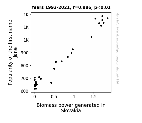 This means 97.3% of the change in the one variable (i.e., Biomass power generated in Slovakia) is predictable based on the change in the other (i.e., Popularity of the first name Jane) over the 29 years from 1993 through 2021.