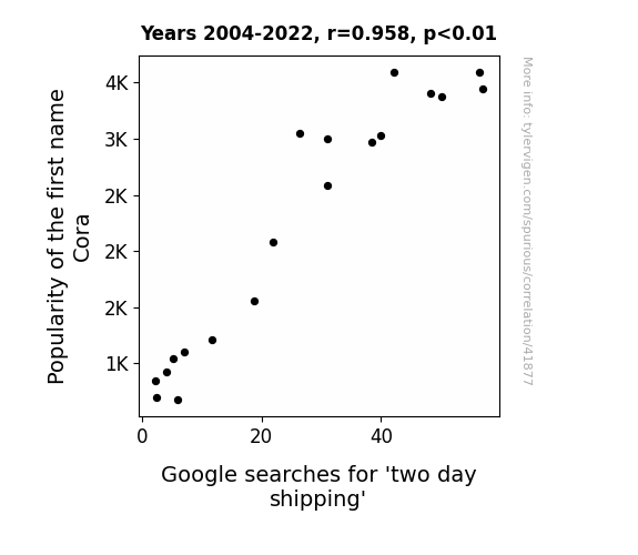 This means 91.8% of the change in the one variable (i.e., Google searches for 'two day shipping') is predictable based on the change in the other (i.e., Popularity of the first name Cora) over the 19 years from 2004 through 2022.